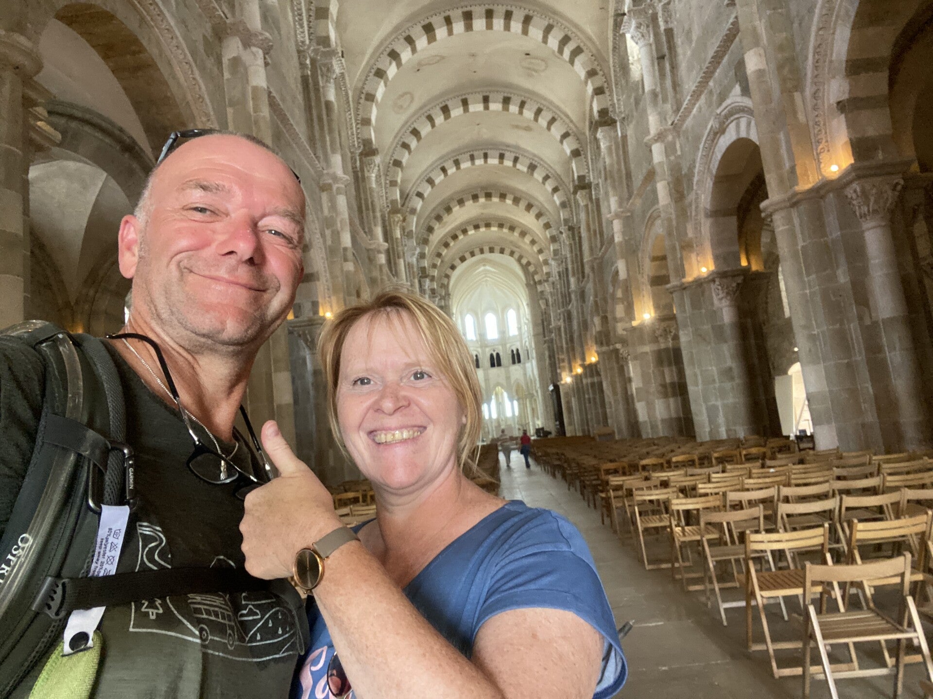 Na een aantal kilometers komen we aan in een piepklein gehuchtje, ergens bovenop een plateau, na een stevige klim: Les Hérodats genaamd. Martinne, een 76-jarige dame die daar al een eeuwigheid woont weet ons te vertellen dat ze daar pas sinds 2007 over stromend water beschikken. Ze troont ons mee naar een boom waar een soort van natuurlijk vensterkader is in gegroeid en waar je, als je er doorheen kijkt, in de verre verte de basiliek van Vézelay ziet. Een mooier plaatje/kader bestaat er niet 👍. We krijgen er lekker gekoeld water aangeboden aan de hand van een kraantje dat er staat langs de kant van de weg en dat door alle vermoeide, en vooral dorstige, pelgrims naar hartelust mag gebruikt worden. Ik vul mijn 2liter waterzak bij ... en weg zijn we. Na een steile en moeilijk begaanbare afdaling komen we aan in Asquins om daar de laatste serieuze beklimming aan te vatten richting basiliek van Vézelay. Goed in het zweet en met een rood aangelopen hoofd komen we aan op onze eindbestemming met 627 hoogtemeters in de kuiten. Daar op een terrasje zitten onze schatten te wachten met een lokaal biertje van Vézelay. We bezoeken samen die mooie basiliek alsook het dorpje zelf. Een dorpje dat duidelijk is afgesteld op de vele pelgrims die daar dagelijks ronddwalen. Ik maak ook nog effe kennis met Conny, een pelgrim uit Dilsen Stokkem, die ik al geruime tijd volg via haar blog maar nog nooit in levende lijve had gezien. Zij zal morgen haar tocht verder zetten via Puy. Ik wens haar alle suc6 toe.