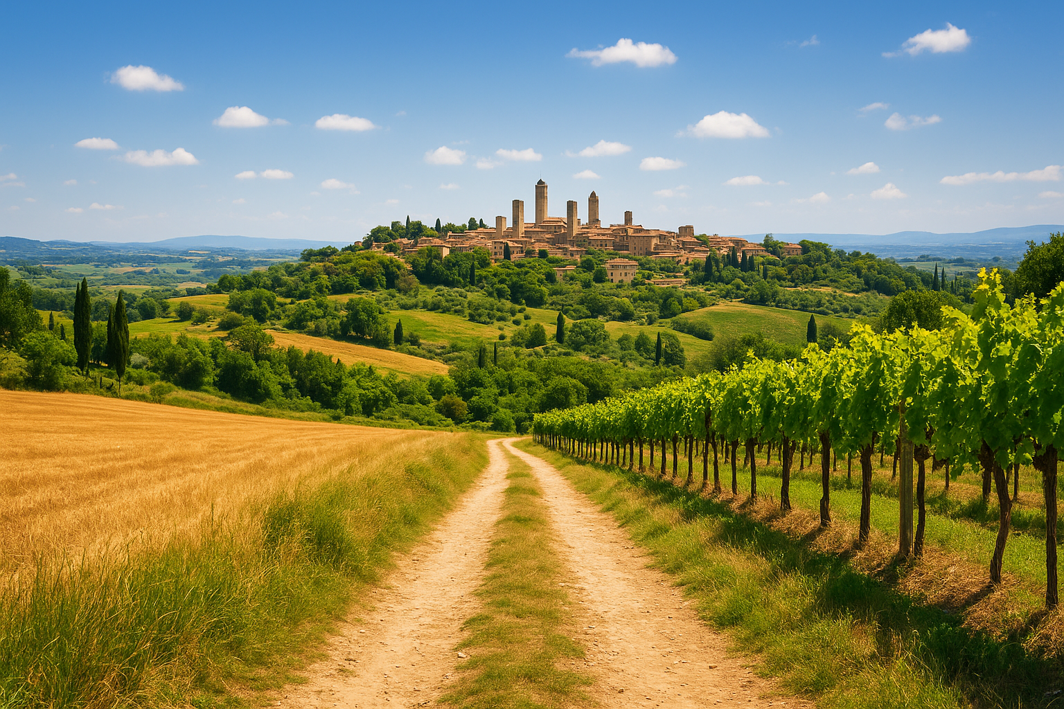 De route volgt oude paden vol geschiedenis en symboliek. Je doorkruist het glooiende Engelse landschap en steekt het Kanaal over naar Frankrijk, waar kathedralen en dorpen vol karakter de weg wijzen. Door de bergpassen van de Jura en over de indrukwekkende Col du Grand-Saint-Bernard ervaar je de schoonheid van de Alpen. In Italië wacht een wereld van kunst, gastronomie en zonovergoten landschappen: van de vlaktes van de Povlakte tot de heuvels van Toscane, waar wijnranken, cipressen en pelgrimsverhalen elkaar ontmoeten.