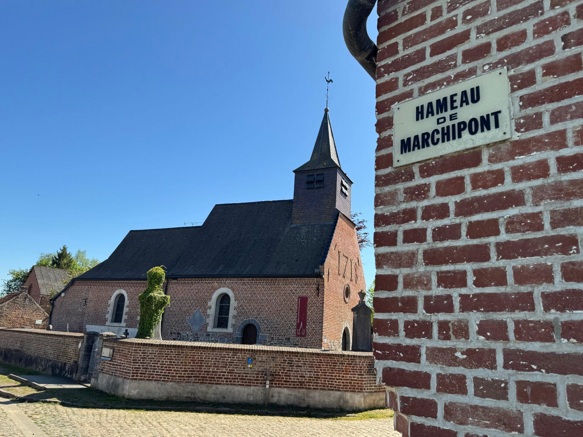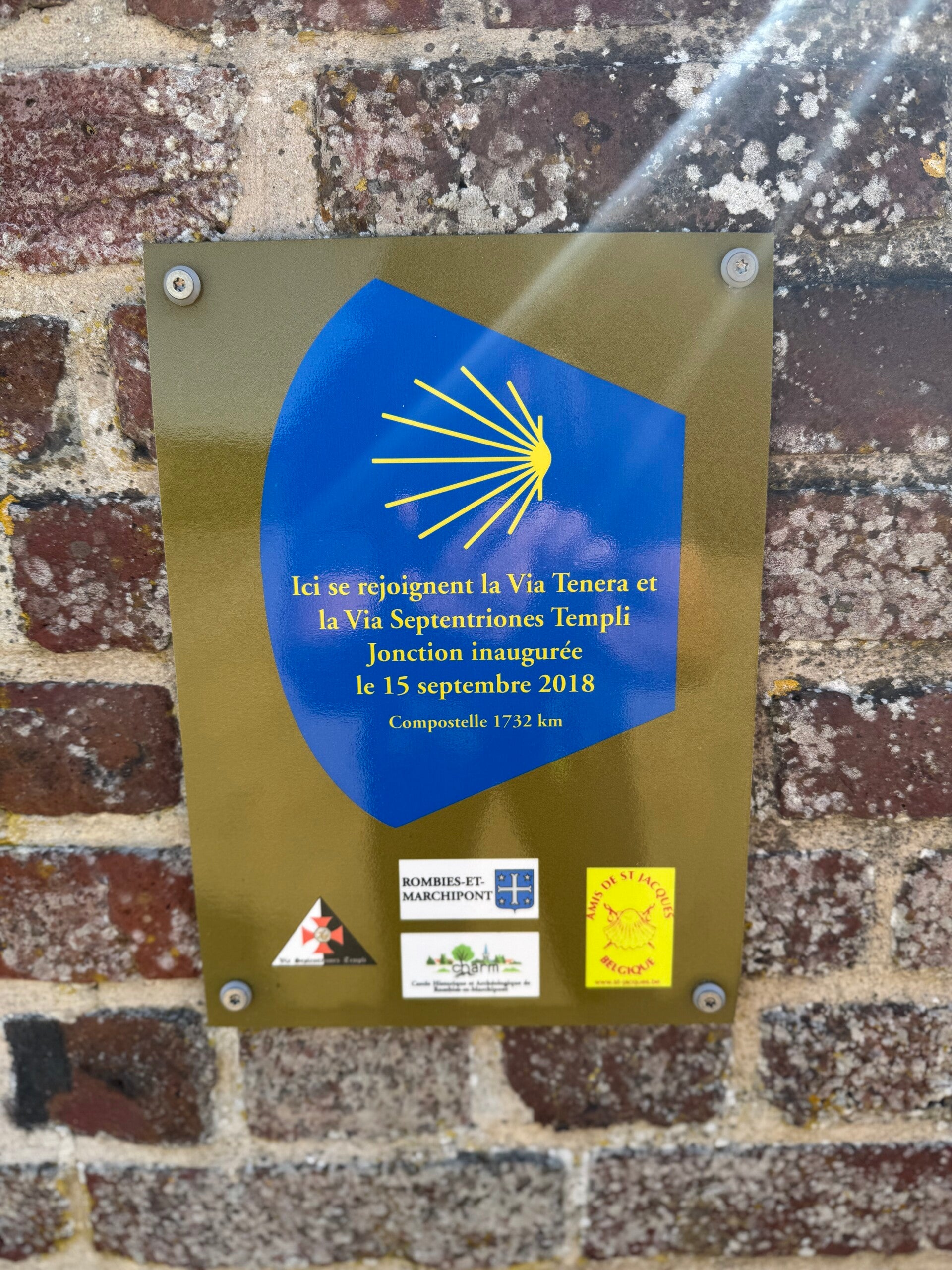 In Marchipont hou ik halt bij de kerk. Blijkbaar een must voor elke zichzelf respecterende pelgrim. In het Sint-Niklaaskerkje uit 1717 staat een prachtig 16e-eeuws Jacobusbeeld. Buiten spot ik zelfs mijn eerste koperen schelp in het voetpad. Maar daar heb ik weinig mee — mijn pad leidt naar Italië, niet naar Spanje.